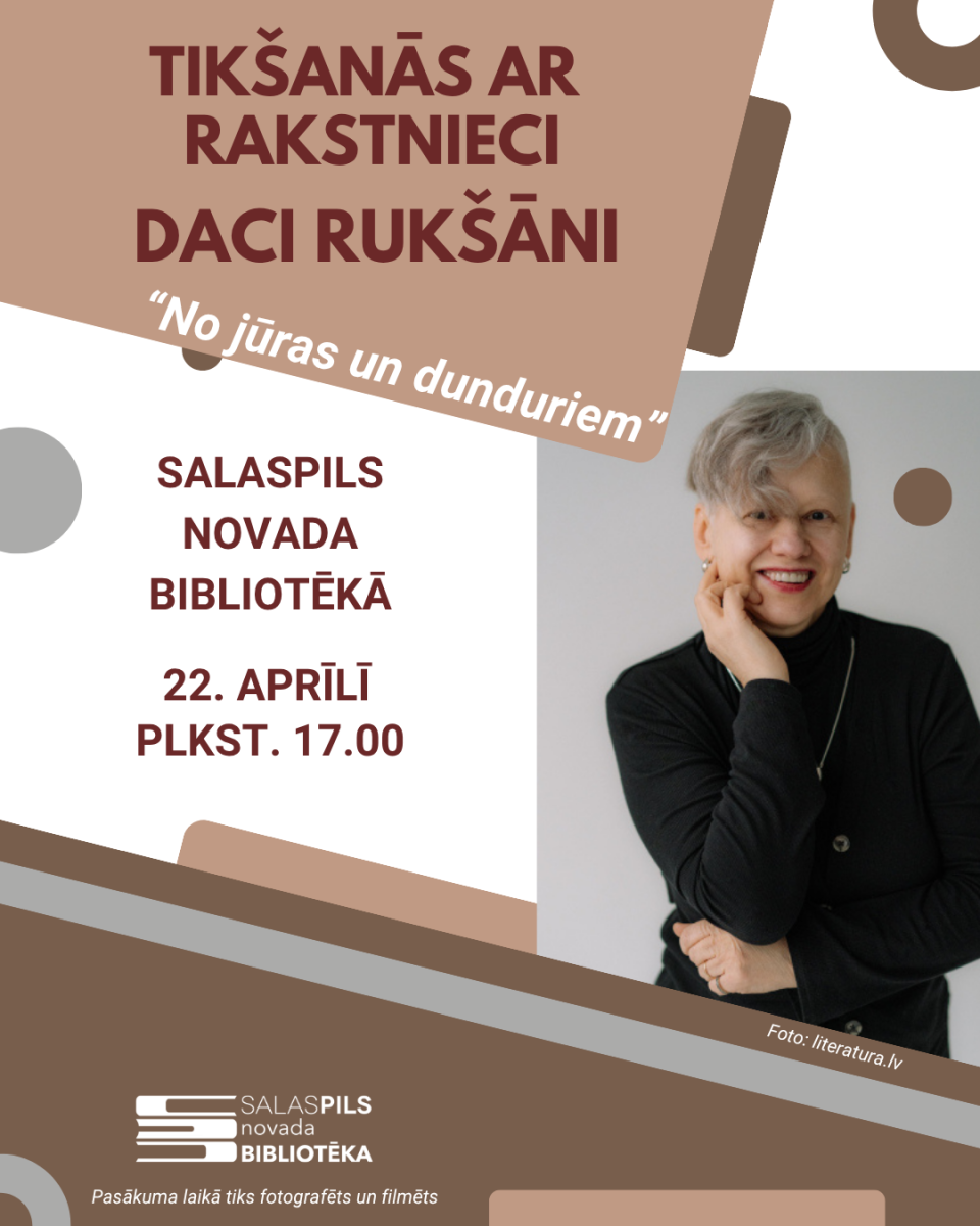 Rakstnieci, publicisti Daci Rukšāni latviešu literatūrā lasītāji zina vairāk nekā 20 gadus. Tikšanās viešņa ir autore stāstu krājumiem, lugām, romāniem, publicistikai.